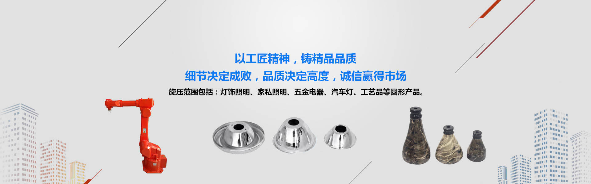 鑫東飛以銅、鐵、鋁、不銹鋼產(chǎn)品生產(chǎn)加工基地:擁有自動(dòng)旋壓機(jī)100多臺(tái),數(shù)控沖壓機(jī)50多臺(tái),配置機(jī)器人對(duì)外承接各種銅、鐵、鋁、不銹鋼旋壓制品生產(chǎn)加工,旋壓范圍包括:燈飾照明、家私照明、五金電器、汽車(chē)燈、工藝品等圓形產(chǎn)品。